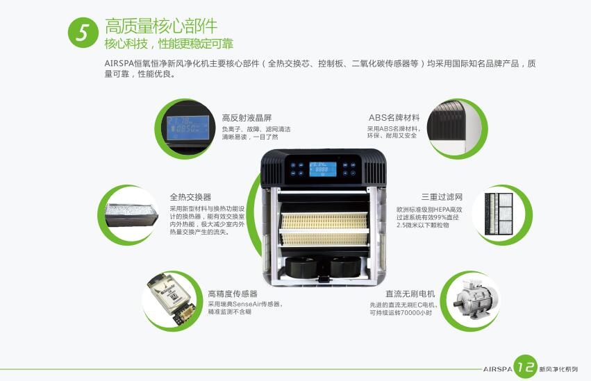 AIRSPA恒氧恒凈新風(fēng)凈化機(jī)主要核心部件(全熱交換芯、控制板、二氧化碳傳感器等)均采用國(guó)際知名品牌產(chǎn)品、質(zhì)量可靠、性能優(yōu)良。